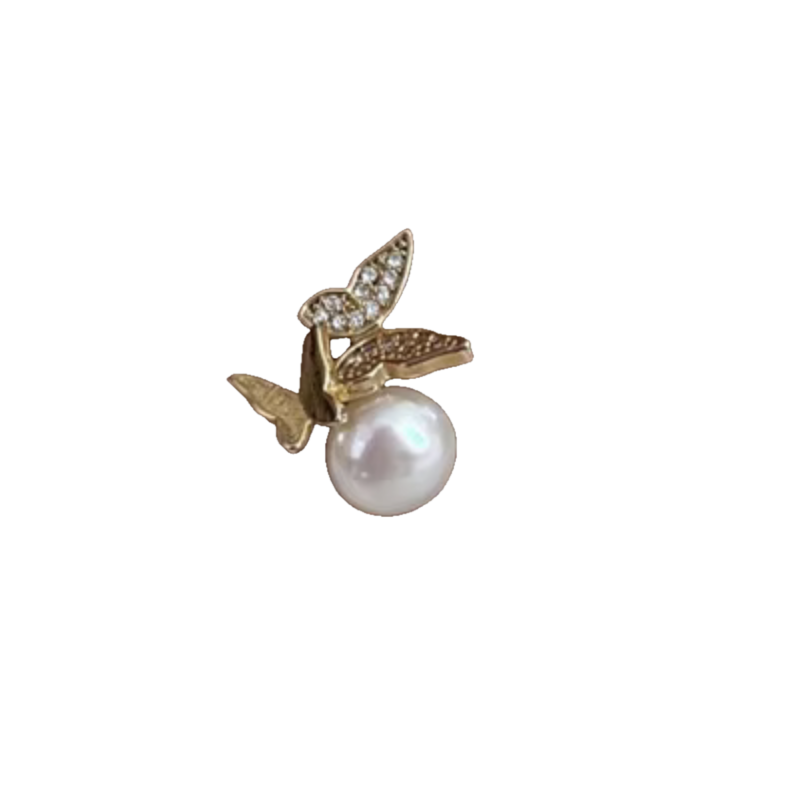 Imearmas pärlil puhkavate liblikatega kõrvarõngas. Kõrvarõnga mõõdud 1,5 cm x 1,5 cm. Suurem liblikas on kaetud säravate helmestega. Ehtes on kasutatudpärlilaadset toodet. NB! Tegemist on üksiku kõrvarõngaga, mis on mõeldud parema kõrva jaoks.