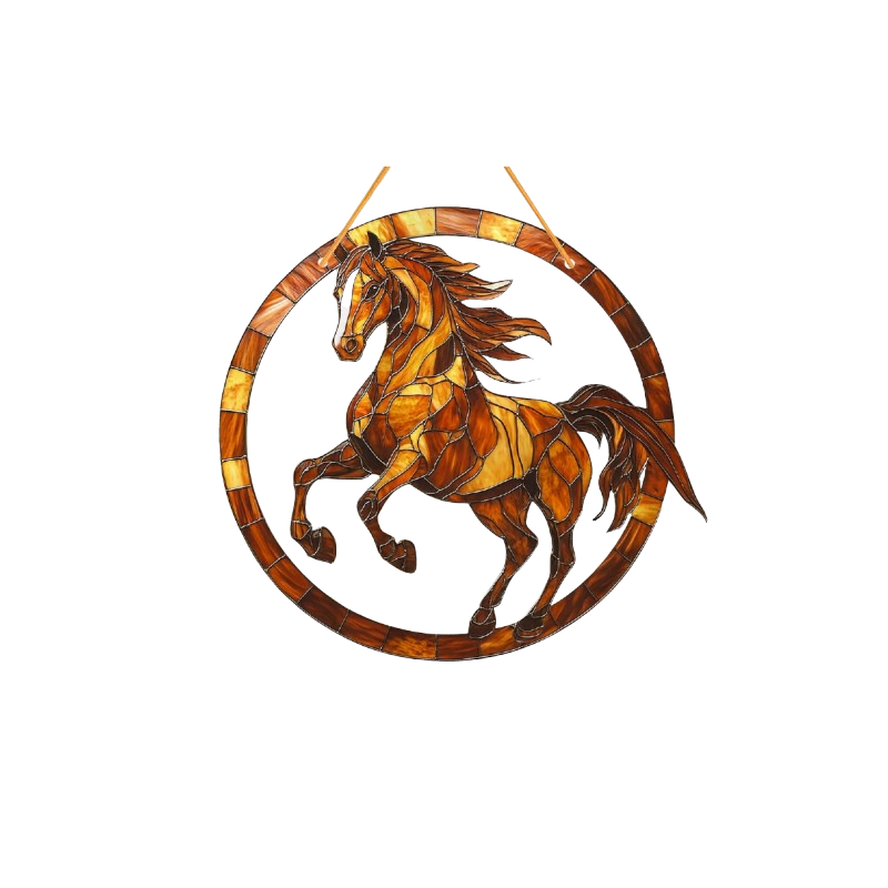 Värviküllane akrüülvitraaž hobuse motiiviga toob ruumi soojust ja energiat. Ümmarguse vitraaži läbimõõt on 15 cm ja selle võib riputada aknale, peeglile, seinale, õue puu külge jne. Kindlasti on toode efektsem kui talle langeb peale kas päikese- või lambivalgus.