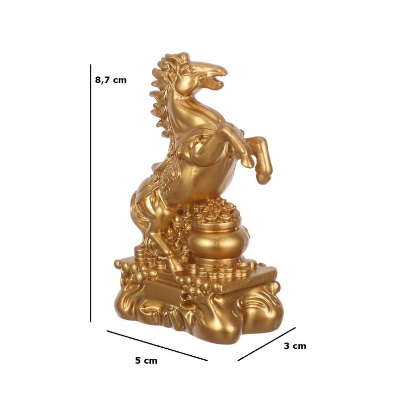 Kuldse tooniga hobuse kuju mõõtudega: 3 cm x (laius) x 8,7 cm (kõrgus) x 5 cm (sügavus).