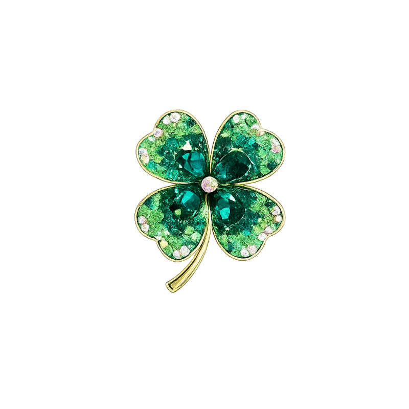 4-lehelist ristikheina lehte kujutav rinnanõel, mõõtudega 3,5cm x 4cm. Ehe on kaunistatud väikeste ja suurte roheliste kristallidega.
