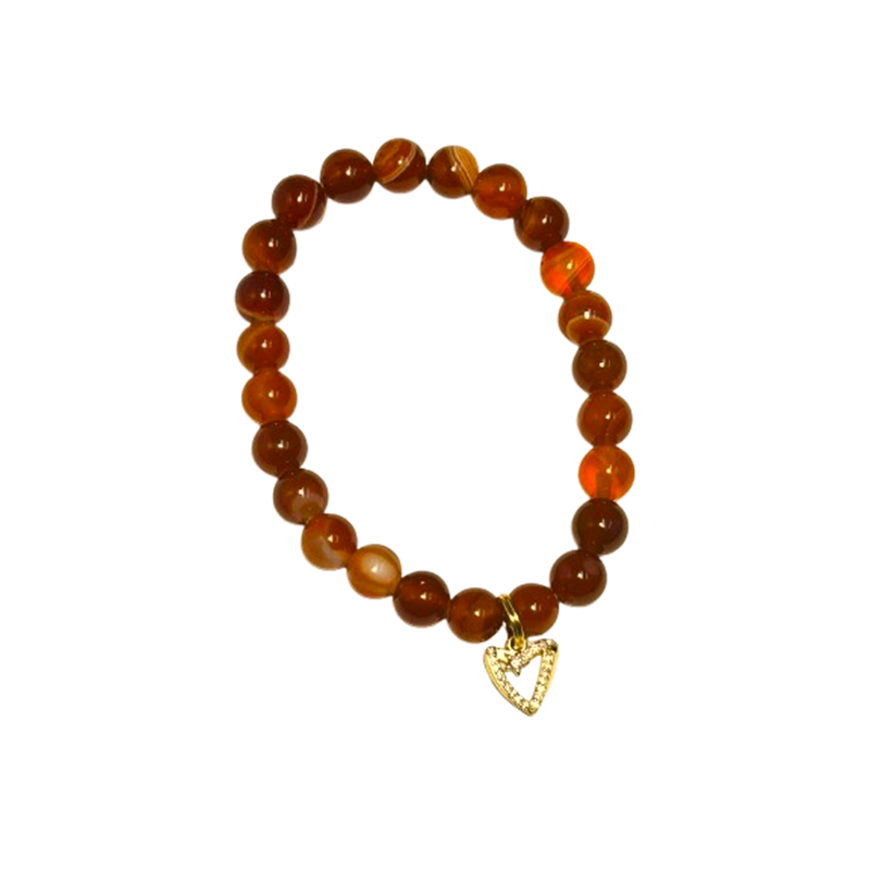 Karneoolist käevõru ümbermõõdule 18-19 cm. Kivide suurus 8 mm. Ehet kaunistab kuldset tooni süda, mis on kaunistatud väikeste tsirkoonidega. Südame mõõdud u 10 mm x 10 mm.