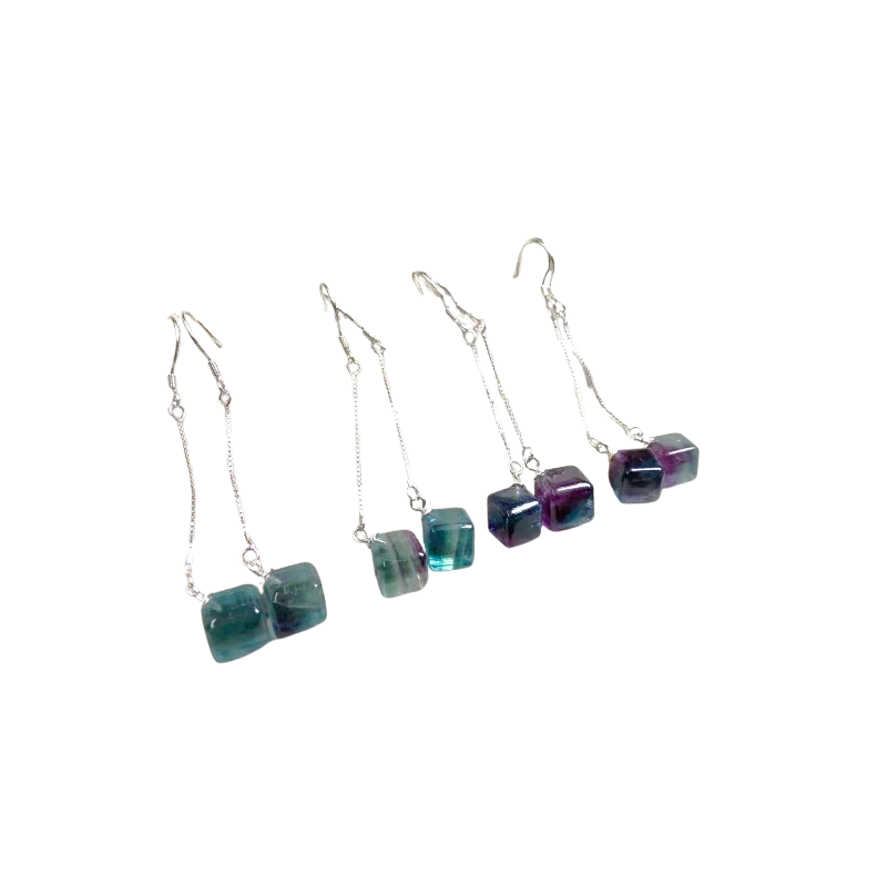 Hõbedast (925) kõrvarõngad fluoriidiga. Hõbedast keti otsas ripub fluoriidist kuup mõõtudega 8mm x 8 mm. Hõbeketi pikkus 2 cm ja kõrvarõnga kogupikkus 3,8 cm ja ühe kõrvarõnga kaal 3 g.