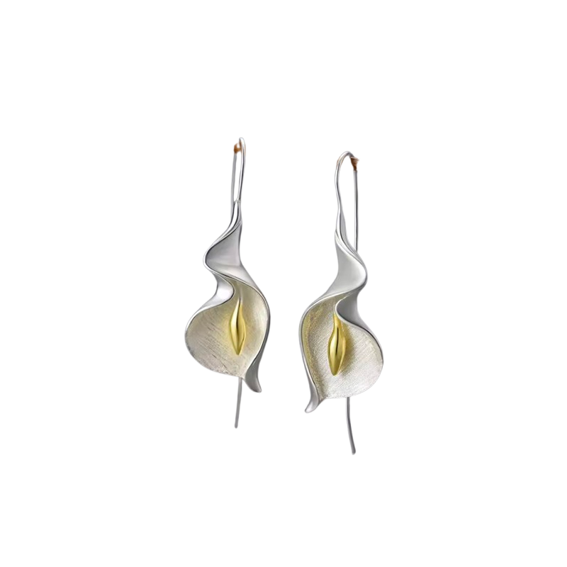 Kalla õie kujulised kõrvarõngad, hõbedase tooniga, kaunistused kuldse tooniga.